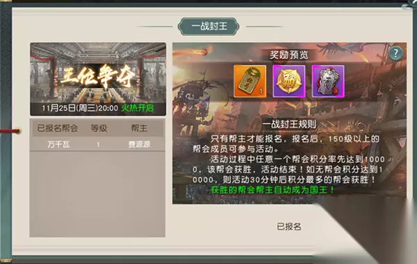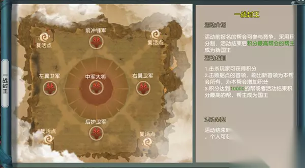 7.进入战场后,在左侧可看到实时刷新的排名以及个人的数据显示。 3)一战封王 Ø开启时间:开服第3天、每周三20:00开启; Ø报名规则:需要提前报名且只有帮主才能报名,报名后,【1转】50级以上的帮会成员可参与; Ø获胜条件:活动过程中任意一个帮会积分率先达到10000,该帮会获胜,活动结束。如无帮会积分达到10000,则活动30分钟后,积分最多的帮会获胜; Ø获胜的帮会帮主自动成为国王;