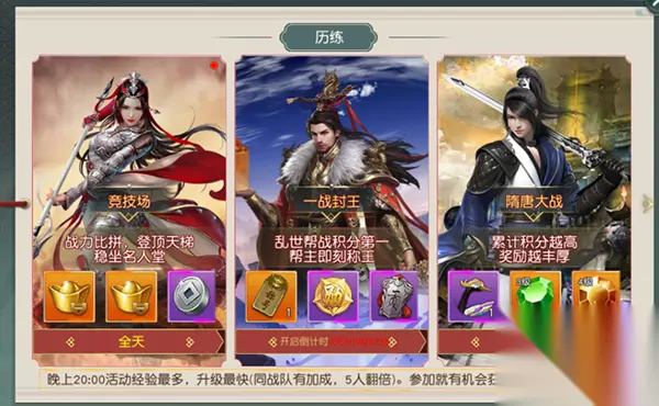 历练系统 包含竞技场、边陲之战、国战、隋唐大战、京畿对弈、王者争霸、一战封王、大乱斗。