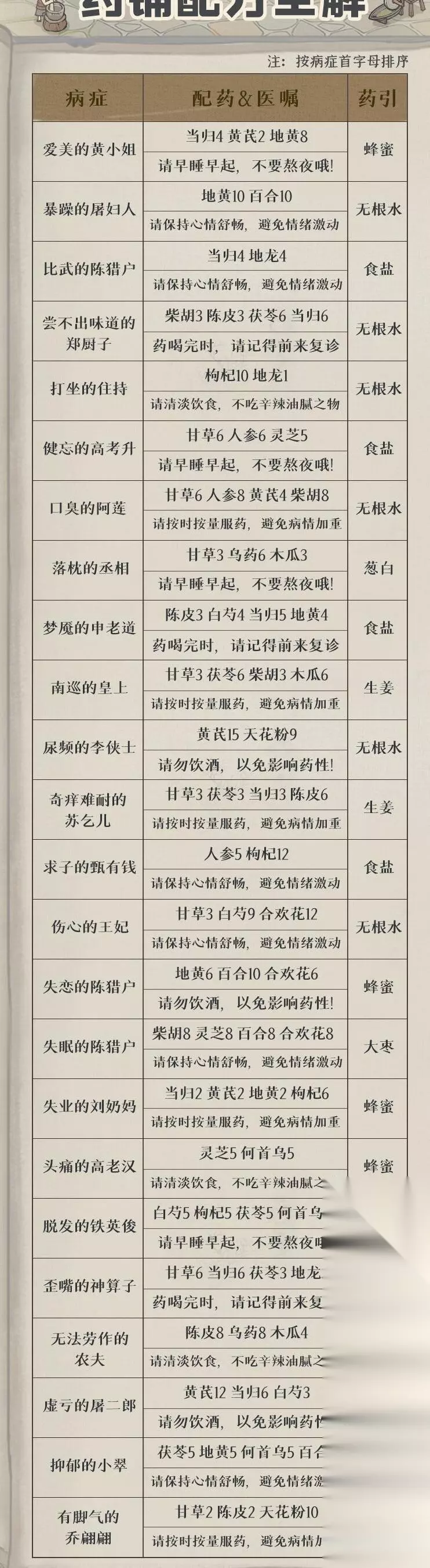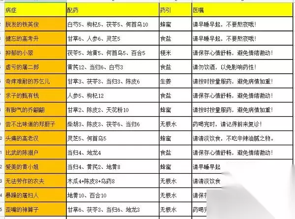 8、尝不出味道的郑厨子 配方:柴胡3、陈皮3、茯苓6、当归6 药引:无根水 医嘱:药喝完时,请记得前来复诊! 9、头痛的高老汉 配方:灵芝5、何首乌5 药引:蜂蜜 医嘱:请清淡饮食,不吃辛辣油腻之物。 10、比武的陈猎户 配方:当归4、地龙4 药引:食盐 医嘱:请保存心情舒畅,避免情绪激动! 11、爱美的黄小姐 配方:当归4、黄芪2、地黄8 药引:蜂蜜 医嘱:请早睡早起,不要熬夜哦! 12、无法劳作的农夫 配方:木瓜4+陈皮8+乌药8 药引:无根水 医嘱:请清淡饮食,不吃辛辣油腻之物。 13、暴躁的屠妇人 配方:地黄10、百合10 药引:无根水 医嘱:请保存心情舒畅,避免情绪激动! 14、歪嘴的神算子 配方:甘草6、茯苓3、当归6、地龙3 药引:无根水 医嘱:药喝完时,请记得前来复诊!