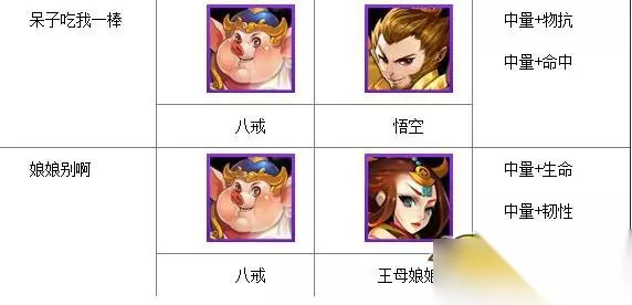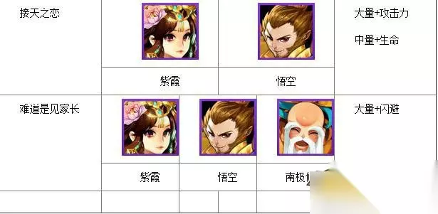 普通难度至少要求全员紫色,困难的话至少要求紫色金边。 观音姐姐:能抗能打能奶,第一人选无争议。没有观音姐姐的玩家,可以考虑根据情况用八戒、牛魔王或者唐僧代替。 王母娘娘:自身防御不错,伪前排也站得住。技能大量回复血量最少的三人,这也是她优于嫦娥入选的主要理由 南极仙翁:此组合中的重中之重,可以说南极仙翁的复活是最重要的保险。只要有他在,即使因为站位或者暴击之类的问题出现误差,也能一个复活保你三星。 紫霞:队伍中的输出,技能针对后排,尽早消灭敌人的dps,可以减轻治疗的压力。 悟空:单体伤害高,暴击高,加快推图速度 好友选择 好友如果有观音姐姐的话,肯定是首选。 没有的话,同样也可以用八戒、牛魔王或者唐僧代替。 阵容组合 虽然缘分组合不是此阵容的关键,也无心中凑到了几个,算是锦上添花吧。
