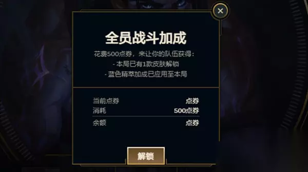 LOL全员战斗加成效果介绍 1、玩家开启全员战斗加成,自己和友军可以随机解锁一款皮肤。 2、对决结束后,还可以获得获得200蓝色精粹奖励,队友则是100精粹。 3、全员战斗加成可以花费500点券解锁,每一局比赛一方仅可有一名玩家购买。 LOL全员战斗加解锁方法 1、点击英雄名称上方的“加成”按钮,即可付费解锁该功能。