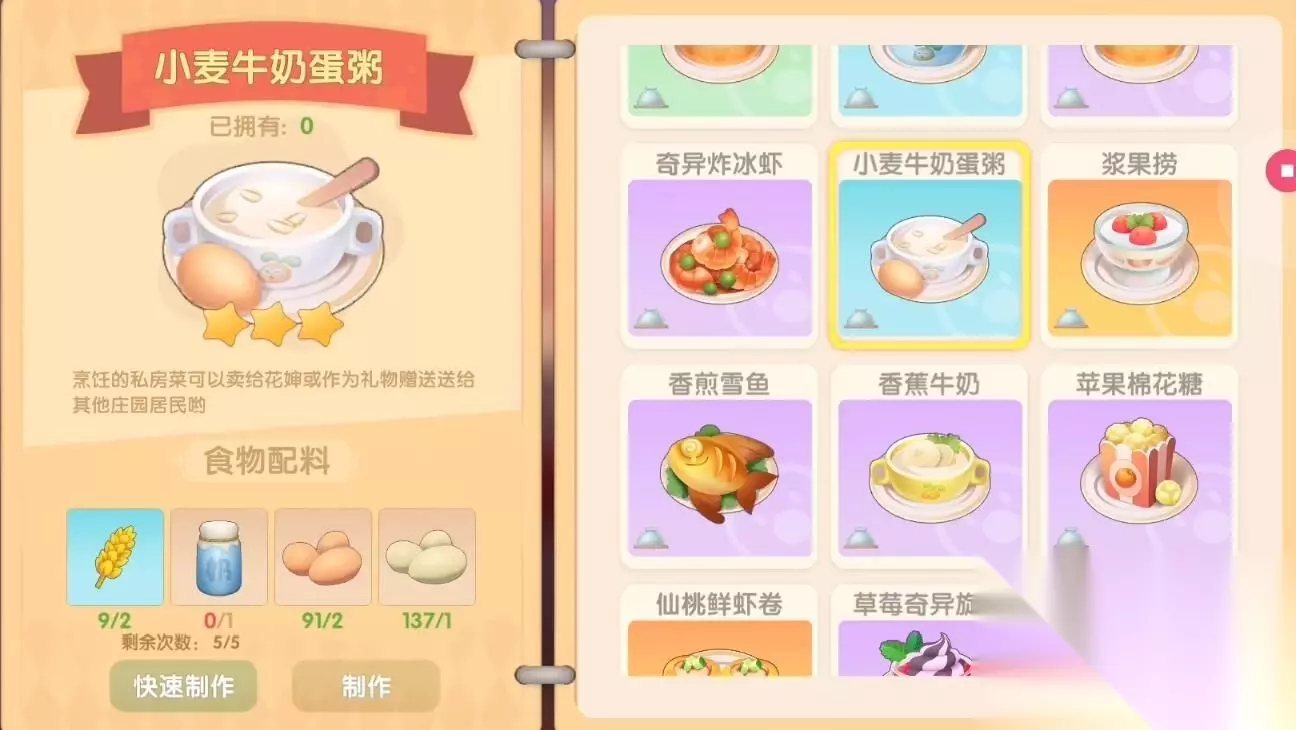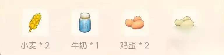 材料获取: 1、鸡蛋:庄园牧场花费90/100买鸡崽/成年鸡,收获鸡蛋; 2、鸭蛋:庄园牧场花费135/150买鸭崽/成年鸭,收获鸭蛋; 3、奶牛:庄园牧场花费450/500买牛崽/成年牛,收获牛奶; 4、小麦:32级种子商店,成长时间1小时。