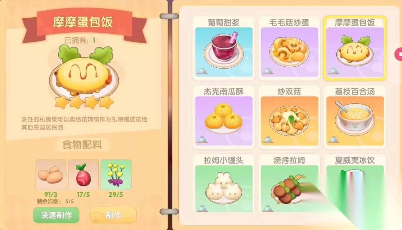 摩尔庄园手游摩摩蛋包饭食谱 食谱配方:鸡蛋*3、红色浆果*5、小麦*5 稀有度:4星