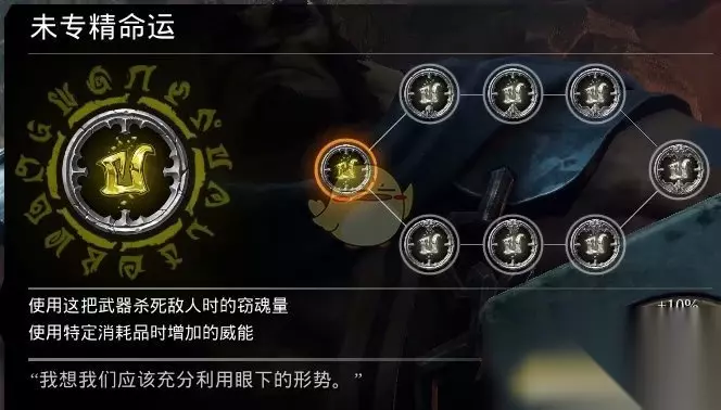 0级:该武器杀敌获得的魂量+10%,特定消耗品增加威力+10% +3:恶魔+25%,天使+25% 平衡:+30%,+30% 评价:没什么用,建议不升(杀怪获得的魂量远比不了捡回来的水晶魂量多,消耗品效果加成也没多大用途)
