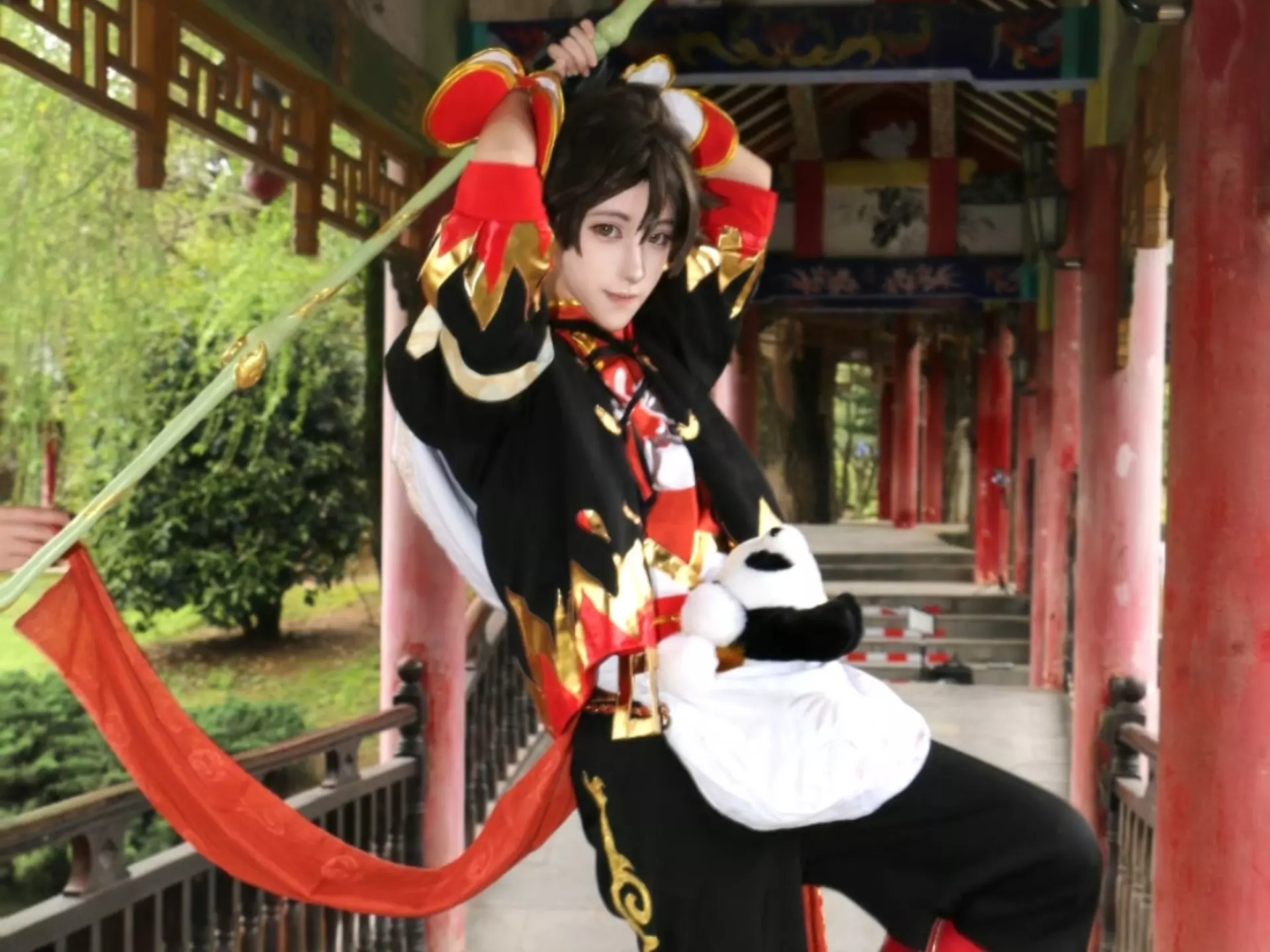 这是一组主题为《cos 只想与她再度相见》的cosplay作品,coser身着带有红金装饰的国风cos服装,在中式古亭中拍摄,呈现出还原度较高的国风cos形象。
