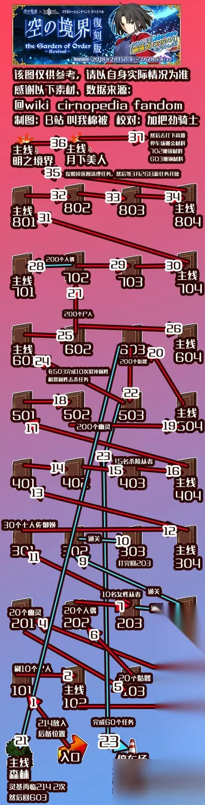 活动准备 1.打通序章 本次活动需要序章通关才能进行 2.准备足够杀式升50级的狗粮 养成任务只要求再临2,不需要满级就能完成任务,不想提前存等着活动兑换狗粮也行 3.均衡的提升练度,想要怼某张图的着重提升对应职介练度 这次活动没有倍卡英灵而且敌方职介全面,根据自己BOX来练就好 4.准备碎石/抽剑式的留好预算 根据自己的需求来吧 活动流程 下面附上流程图,需要注意这个图是从下往上看的: 从入口出发,按箭头上的数字顺序进行攻略即可。