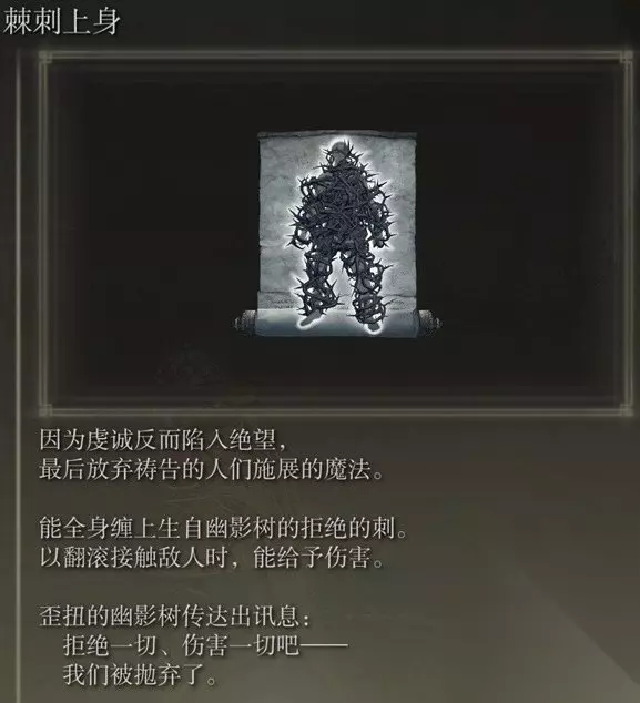 获取方法详情>>>艾尔登法环DLC魔法拒绝的刺获取攻略 七、荆刺上身 艾尔登法环荆刺上身在赐福教区入口击败腐树获得,从赐福穆斯废墟出发到幽影城教区跳房子到目标房顶然后继续往上走到放低破损处跳到下方白色的顶梁上。