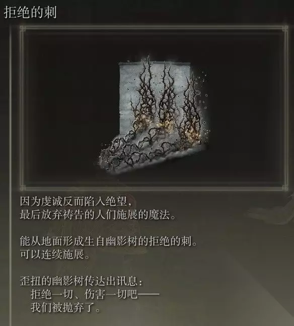 获取方法详情>>>艾尔登法环DLC魔法融泥漩获取攻略 六、拒绝的刺 艾尔登法环拒绝的刺在幽影城外尸体上获得,尸体在影城外侧台阶上,从物种保藏库的1楼赐福点出发,往左前方一直走到前方的楼梯上到二楼,然后找到楼梯上到第四层。
