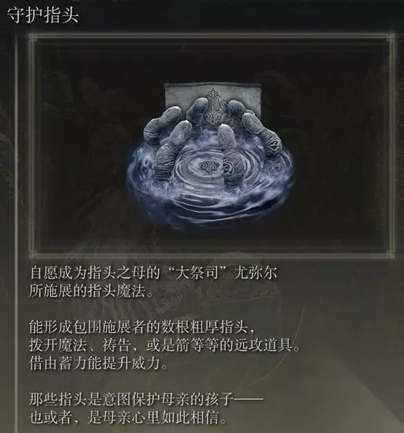 获取方法详情>>>艾尔登法环DLC魔法辉石繁指爪获取攻略 十三、守护指头 艾尔登法环守护指头在墓地拾取获得,获得此魔法需要完成尤弥尔的支线任务。