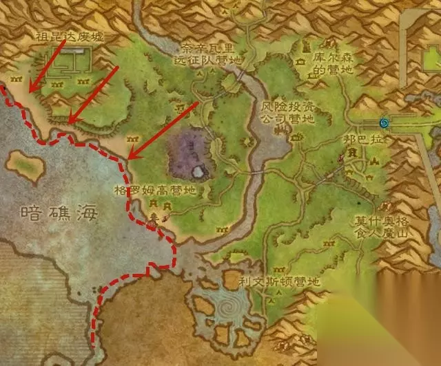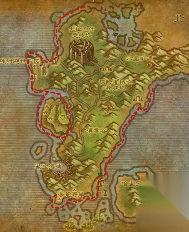 注:渔点上钓鱼不是或太边缘不确定直接重新出杆,即便浮漂在鱼点上还是会出杂鱼,所以沉住气。 还有点小建议:找一个人少的服务器,找一个人少的星期日,握紧你的鱼竿,向着胜利冲吧! 完成上述的准备工作后,就可以提前半小时,去往藏宝海湾,绑定你的炉石,再去往荆棘谷的最上方,寻找一个有超过2个鱼点的海滩边,等待比赛的开始,顺着红色虚线往下钓。 注 :一定要提前。
