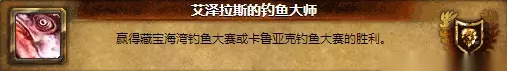 注:本来诺森德也有“卡鲁亚克钓鱼大赛”的。因5.0当时的位面技术不完善,导致玩家利用BUG秒完成,所以两个大赛一度同时取消,后来等修复好后,“卡鲁亚克钓鱼大赛”也就没再加入;本来属于它的奖品,现在也被合并到了“荆棘谷钓鱼大赛”中了! 全部(全国)服务器前50名,获得”艾泽拉斯钓鱼大师”成就。