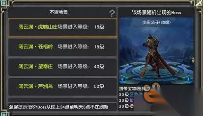 1.BOSS在活动时间内每半个小时至一个小时刷新一次,如果当前BOSS未被击杀,则不会刷新出新的BOSS;每天晚上24时至6时不会刷新BOSS。 2.BOSS刷新时有系统公告。 3.造成伤害的前5名玩家以及第一个击杀BOSS和最后一个击杀BOSS的玩家均可获得道具奖励。 4.每个玩家只能获得一份奖励。 5.击杀BOSS没有武盟限制,击杀仇盟BOSS也可获得奖励。 6.击杀BOSS时若没有掉落道具,也会根据伤害量获得碎银和经验奖励。 7.击杀高于自身或低于自身15级的BOSS没有奖励。