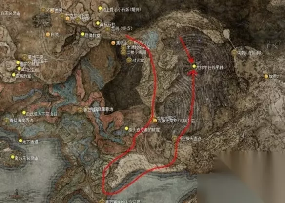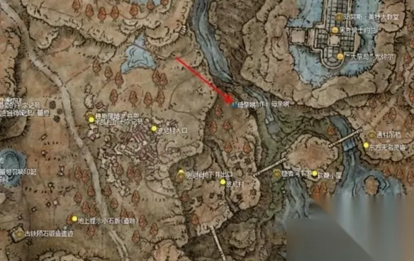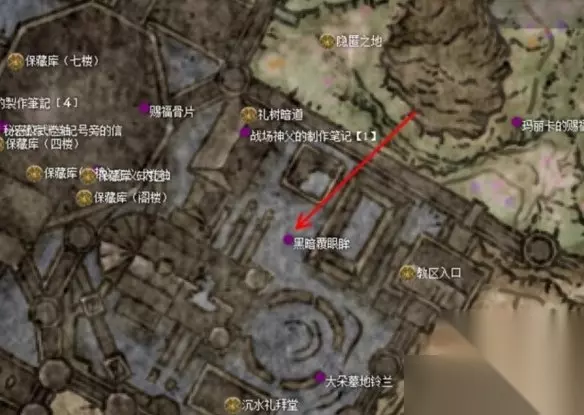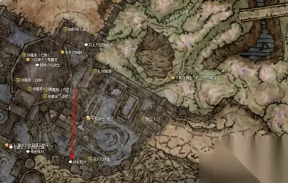 3、然后返回尤米尔处,和他对话获得护符和第二张遗迹地图,再去和约兰对话。(如果这时候还没有击败梅瑟莫,那么在梅瑟莫 boss 房间门口可以选择召唤约兰)。坐下赐福点,去墓地和尤米尔对话。这时候可以返回教堂打开尤米尔座位的机关前往密亚指头遗迹,在里面被另一位黑夜骑士安娜入侵打败黑夜骑士获得她的武器(注意只有一次机会)。回到尤米尔处和他对话,再和约兰对话。 4、第二处地图在狄亚指头遗迹,在教区大道方向前往幽影城的教区入口,在教区这里线沿着房顶跳跃直到能降落在一处房梁上下来找到排水机关把它打开(下图)。排完水去找升降机到达物种保藏库的另一侧。沿着梯子和升降机到达顶处的房梁,再跳到下一层的房梁,你可以再从这个房梁跳到某处大平台,通向外面有两个向下的升降机,最终抵达幽影城后门。赐福点右侧对玛莉卡雕像使用“母亲啊”姿势前往狄亚指头遗迹,吹响中央的吊钟。
