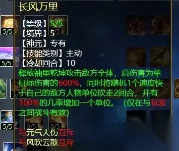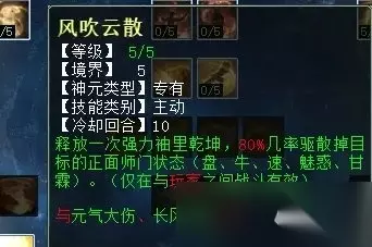 “风吹云散”有几率将对手的盘、牛、速、甘霖、魅惑吹掉,对战血队或者敏队都有极高的战术意义。第二排大招点出手,还可以几率吹掉对方的法宝状态,如将军令、黑龙珠、鬼手、绝情鞭等。