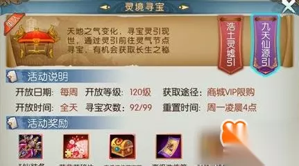 2、九天仙源引: 获取途径:VIP商城购买。一周购买次数30次 使用条件:无需组队,单人可使用 活动有次数限制,个人购买寻宝引有次数限制。 使用方法:使用方法:在背包中使用九天仙源引,会自动寻路到指定寻宝地点,提示“已达到天地灵气节点,是否使用九天仙源引激活该节点”,点击"确定”即可激活。