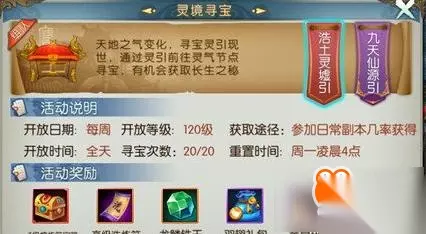 逐次刷出怪物,每第5波刷新BOSS。击杀怪物获得奖励。副本限时3分钟。 三、活动奖励 1.奖励说明: 宝物奖励:奖励随机出现,同一队伍也可能获得不同奖励。 守护怪物:掉落奖励归属于创建并消耗寻宝次数的队伍。 灵境副本:奖励一有多种类型,对应奖励可能不同。 使用寻宝灵引的玩家会得到额外贡献奖励。 3.浩土灵墟引奖励: 随机掉落强化宝箱、黄泉阵灵碎片、羽翅礼包、龙鳞铁玉、高级洗炼符、高级熔炼符宝箱。 4.九天仙源引奖励: 随机掉落强化宝箱、黄泉阵灵(整卡或碎片)、高级洗炼符、高级熔炼符宝箱、花非花法宝、时装坐骑礼盒、各门派随机真仙装备、坐骑[羽皇·赤]。