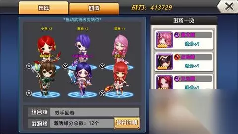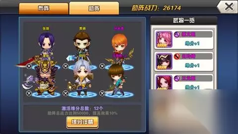 布阵六个位置,助阵六个位置,一共有12个位置,想要最大化提升队伍的战斗力,就一定要安排好这十二个位置! 首先是布阵,主角是一定要上场的,并且占据着前排中间的位置;那么在选择其它五个武将的时候,就一定要慎重搭配,下面列出一些布阵的技巧,大家可以参考一下。 1.前排可以放一些生命较高、防御较强的防御型英雄,这样能够抗住更多的伤害; 2.在选择英雄的英雄,一定要注意英雄的组合技能,两两搭配四个英雄可以释放两个组合技能; 3.英雄的阵营选择也很重要,例如吴国的英雄如果在场的话,神转技能获得的吴国被动属性提升就都能受益; 4.注意武将缘分,匹配的武将在场的话,可以提升上场武将的属性; 5.助阵武将主要用来激活上阵武将的缘分效果,助阵武将的战力越高,武将能够提升的缘分效果加成就越多!