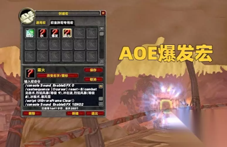 部分玩家可能觉得霜火法的输出手法比较复杂,其实是非常简单的,在AOE阶段只需要使用1个宏就能打出很高的伤害,在BOSS阶段也就3个常用技能。 /console Sound_EnableSFX 0 /castsequence [@cursor] reset=8/combat 龙息术,烈焰风暴(等级 9),冲击波,烈焰风暴(等级 8),冰锥术,暴风雪 /script UIErrorsFrame:Clear() /console Sound_EnableSFX 1END2 霜火法的AOE宏囊括了所有的爆发AOE技能,在小怪阶段直接按宏就可以了。简单来说就是3秒打出5个技能,伤害非常夸张。不过在使用这个宏的时候需要看团队内的MT是否强力,如果不强力的话,可能会直接AOE。这个宏还有一个特点——要么小怪倒下,要么自己倒下。