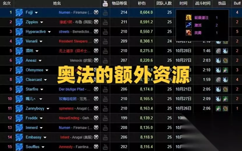 很多老玩家看到霜火法的第一感觉可能就是不屑,毕竟WCL上奥法的排名比较高,并且竞速团也都在使用奥法。然而问题在于又有多少玩家能够参与竞速团和冲榜团呢? 细心的玩家可以发现,WCL上法师榜单的确是以奥法为主,但是这些排名靠前的奥法往往可以吃到大量的团队资源,比如多个能量灌注和多个激活,而野团玩家是无法获得这些资源的。