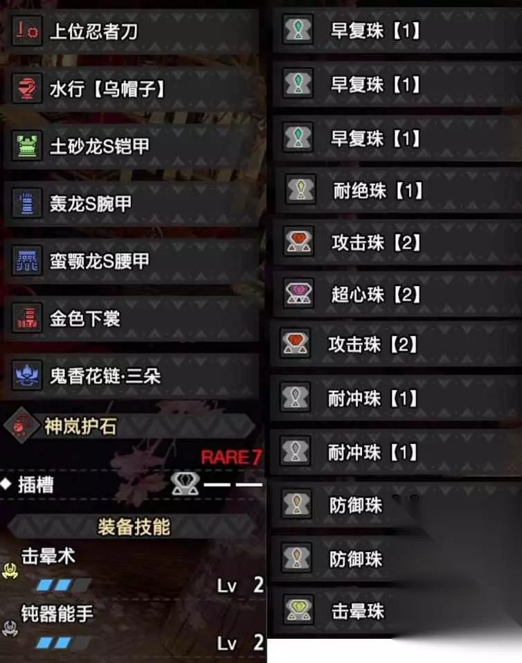 ccy 工匠配绿斩武器,浪费。就算升到顶,也不过是蓝剁,很容易没味道,不用麻烦。ccy 绿斩是100%理解,也就是说即使你的位置不在怪物的柔软部分,你也可以造成不错的伤害。而且为了防止打刀,眼睛水平一定要饱满。ccy 绿斩武器最好的技能入口自然是钝器专家,达到满级后可以增加1.1倍的攻击力。ccy 既然需要理解,那么毫无疑问,超理解必须完全匹配,才能尽可能提高理解伤害。ccy 没有属性的手剑输出模式一般是盾击,而盾击有眩晕值,所以绝色手法也可以完全匹配。ccy 剩下的升级空间主要可以攻击。ccy 不是很多玩家都说打不到弱点,所以弱点配特效没用吗?那么这个方案完美的解决了你的问题,无论你把刀打到哪里都可以知道怎么用!我不会玩刀!ccy 下面是一些岩石守卫,如下图所示。你可以按照我的计划来适合他们。ccy 我根据个人喜好配置一级洞的装饰珠,对战斗影响不大。也可以根据自己的想法改变,或者根据狩猎目标灵活改变。ccy