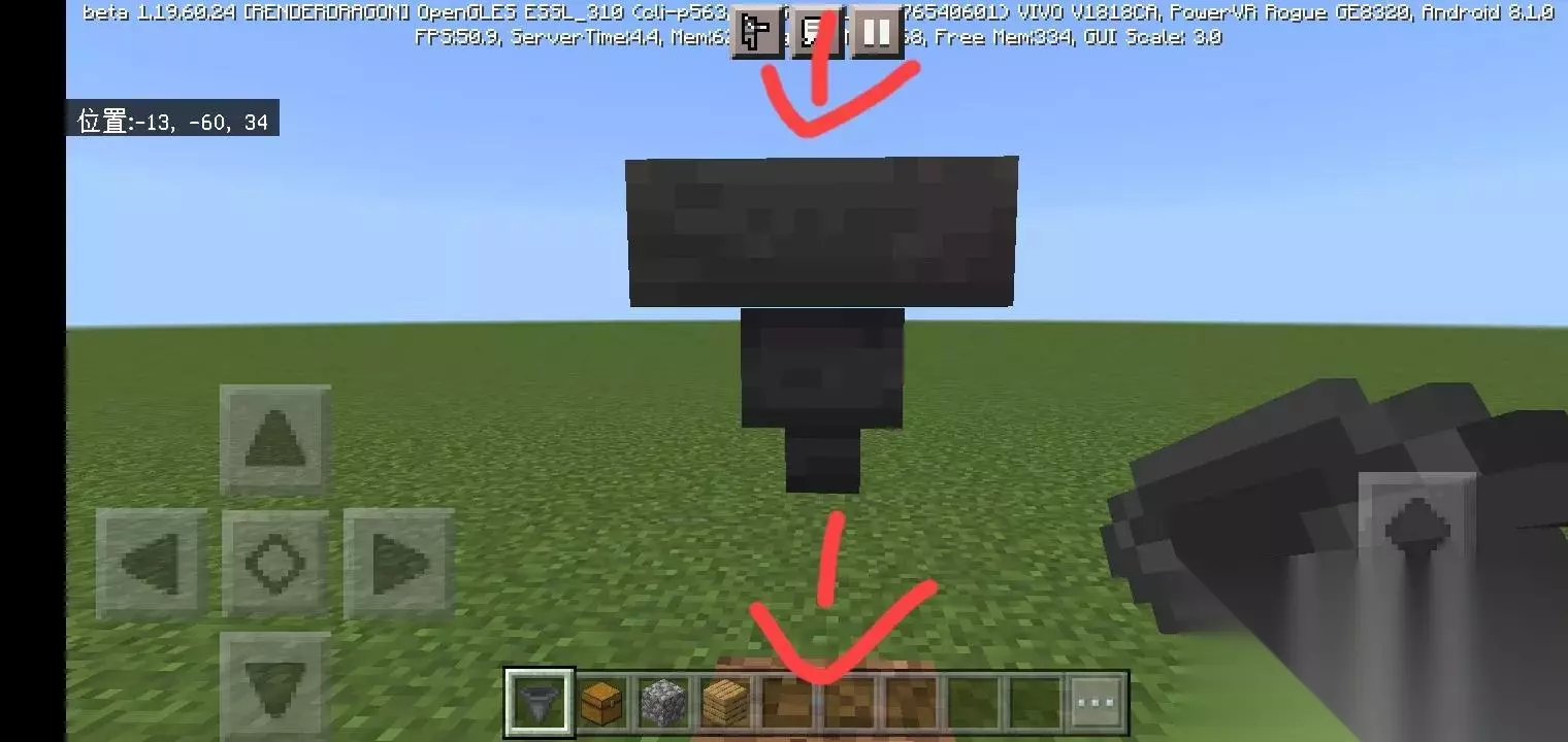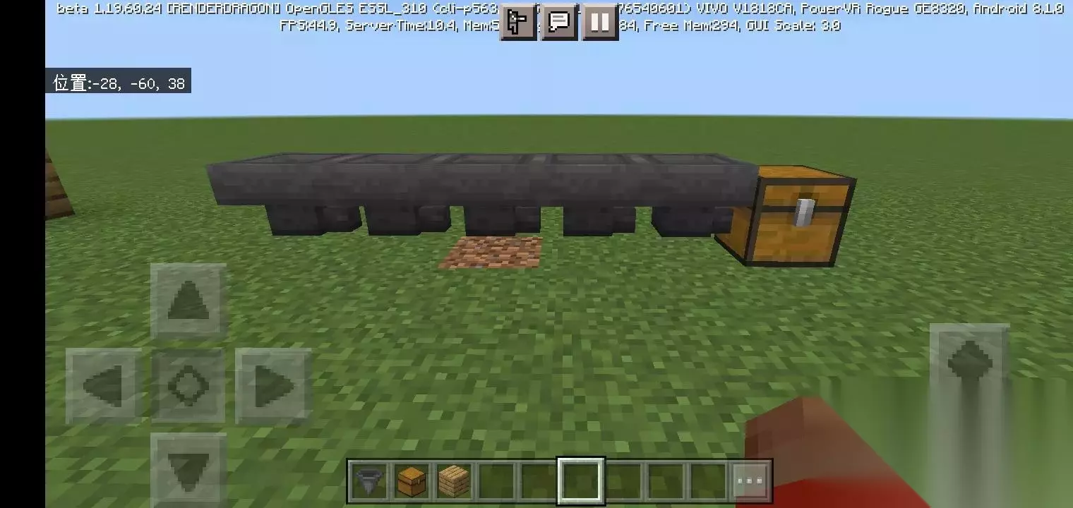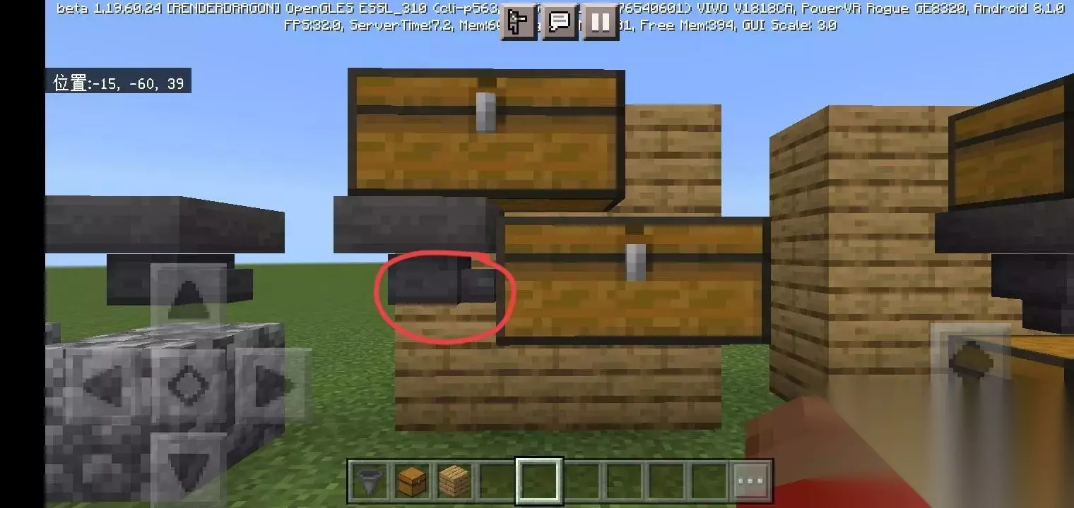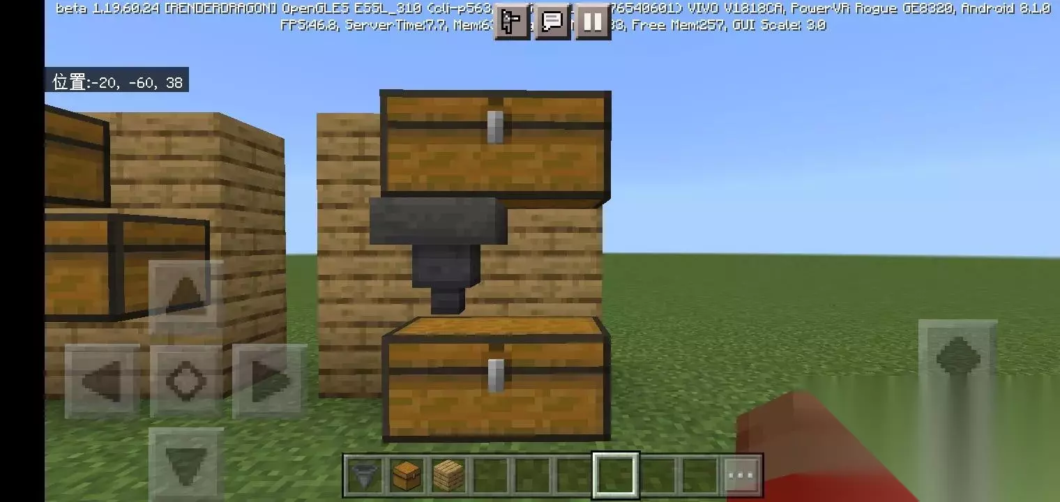 图中的漏斗可以收集上方的掉落物品,并将物品向右传递至箱子。漏斗的放置方式依旧是潜行,再对着右边的方块按一下。 注:如何变成潜行状态。 双击十字键中间的那个键,再按两下就是恢复。