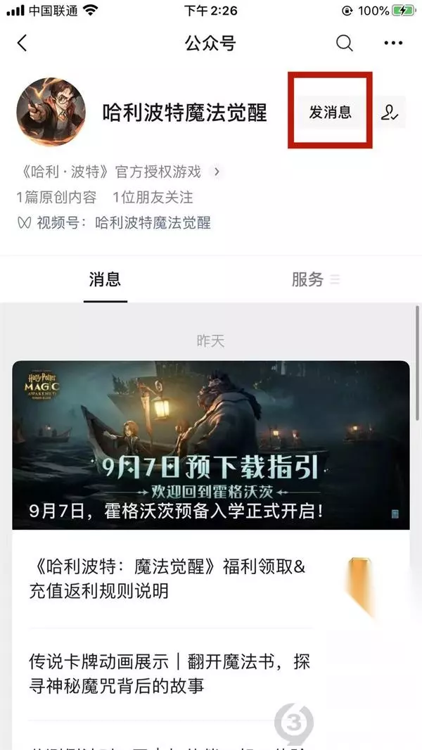 2、关注公众号后,点击进入消息界面;