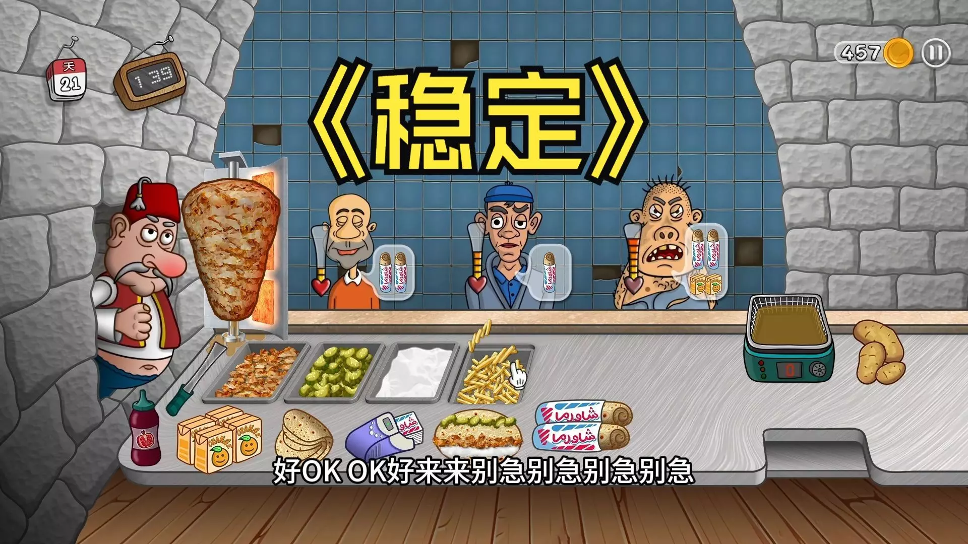 这是一期沙威玛店经营游戏实况,展示了玩家在游戏中制作沙威玛、薯条等餐品,接待各类顾客的过程,其中店主对乞丐顾客十分友善,呈现了趣味的小店经营日常。