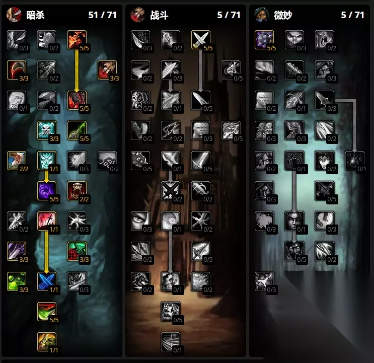 魔兽世界的wlk已经正式的上线了,很多的小伙伴都在重新的练级,并且游戏里面有很多的职业可以去选择,今天给大家带来的是游戏里面的战斗贼副本练级天赋加点,下面就是具体的内容. 魔兽世界战斗贼副本练级天赋加点 WLK版本中战斗贼天赋加点推荐加点20,51,0,本天赋为当前版本传统战斗贼推荐天赋,战斗天赋中1点耐久是过路天赋,可根据需要调整为强化疾跑。 1.战斗贼天赋加点:推荐加点20/51/0,大雕文选择杀戮盛筵雕文、割裂雕文,影袭雕文收益前期不是很高,所以前期不用考虑此雕文,小雕文选择消失雕文,其余随意选。 2.本天赋为当前版本传统战斗推荐天赋,战斗天赋中1点[耐久]是过路天赋,可根据需要调整为强化疾跑。 3.二十五一这么点,割裂剔骨随意选。如果打本不洗脸,割裂稳定威力显。
