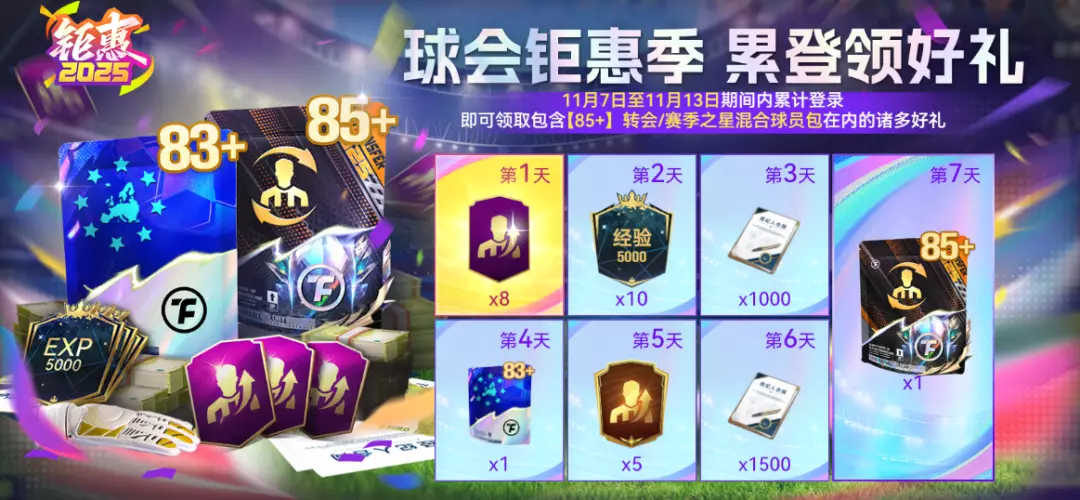 活动期间累计登录,即可获得包含【85+】转会/赛季之星混合球员包在内的诸多好礼。球会钜惠季来袭,连续登录即可坐收豪华奖励!无论各位主帅是想为球队补强还是调整阵容,只要坚持每天上线,就能为球队注入全新能量。签到越勤奋,惊喜越丰厚。本周的每一次登录,都是迈向巅峰的稳健一步!