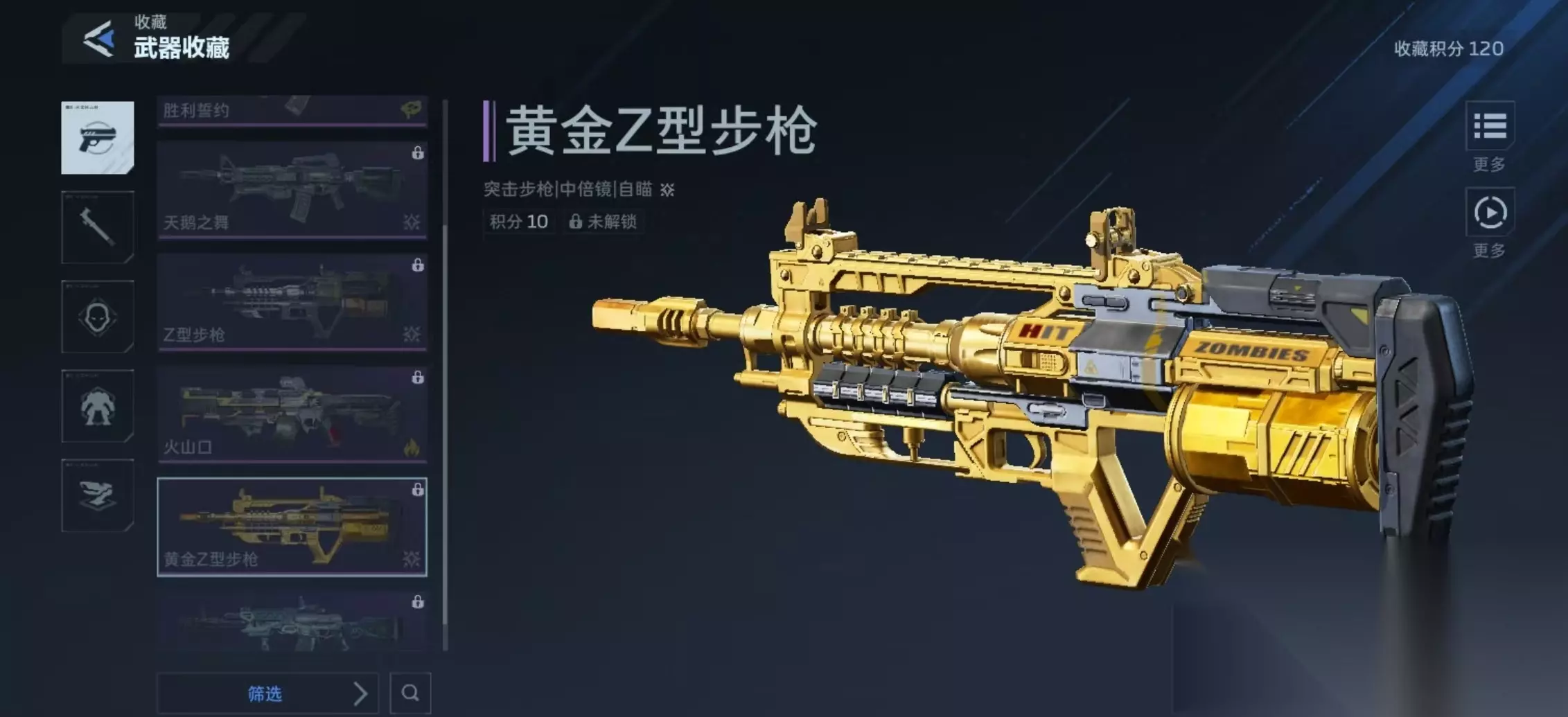 首先点击活动,进入到活动界面中的收藏功能,这里可以看到当前所有可收藏的部分。包括陷阱、武器、角色、机甲等在内。收集的越多,累计获得的收藏积分就越高。初始是青铜收藏家V级,后续不断提升等级可以往上提升段位,当提升到青铜收藏Ⅱ级时,就可解锁黄金Z型步枪奖励,以及获得大量gp点数。所以这也是一款可以不充值直接获取到的枪械,但是需要漫长的收集过程。但是小编认为这款武器值得大家投入时间,因为它的属性和技能都很出色,作为一款突击步枪,它具有自瞄的功能,单发伤害56,射速624,弹夹70,总弹量770,精准度68,稳定度53。这些属性就展现出了不俗的输出能力,高弹夹容量可以持续战斗。