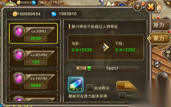 原力的终极到底是什么?《世界2风暴帝国》聚力系统上线啦! 千百年与大自然的斗争之中,机械阵营一直在找寻大幅度提升力量的有效方法。随着科技日益发展,机械阵营终于在原力的基础上,研发了更进一步缩聚能量的聚力器。聚力器可通过极高温和压力使原核外子逃离原子核,让原子核碰撞发生聚合作用,引发巨大的能量释放,进而转换成人体机甲能量,大量提升人物属性! 【打开方式】 可在【成长】-【原力】-【聚力标签】下查看聚力界面 【注意事项】 1、 玩家等级到达48级开放聚力系统; 2、聚力需要消耗聚能,不同聚力等级需要消耗不同阶别的聚能; 3、聚能可通过原力副本获得,也可直接购买; 4、聚力等级越高,可获得的属性值越高,但是聚力等级不能超过人物等级; 5、聚力共有10个属性,聚力值不共享,聚力等级互相独立。
