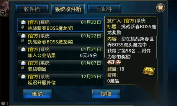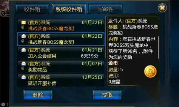 t15_2-t15_1:8.0 标签: 金币 新年将至,《狩猎者联盟》新春活动又是一大波来袭,本次新春世界BOSS到来,下面跟随便小编来看看挑战新春BOSS的条件与奖励。 双头魔龙挑战奖励发放总数: 32个勇者宝石LV1 700金币 2700福利券 红装装备宝箱 双头魔龙召唤者专属奖励: 5-20颗富豪宝石LV1或5-20颗富豪宝石LV2 召唤费用:双头魔龙(5800金币)、远古石魔(2600金币) 挑战人数:100人