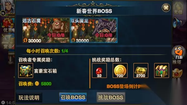 本次新春BOSS每小时召唤次数4数,跟随着土豪的脚步进入挑战BOSS吧,每次挑战都有BOSS登场倒计时,不过你可要眼急手快,手慢就是“挑战人数已达上限”进入之后狂会出现一只双头龙BOSS,和无数小怪,由于人数较多,可能出现卡屏,掉线等之类的情况,属正常情况,这在任何游戏里都经常出现,因为大家都在狂放技能嘛。
