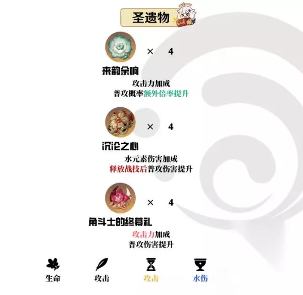 2.主词条: 时之沙(攻击)、空之杯(水伤)、理之冠(暴击率/暴击伤害) 3.有效副词条:暴击伤害、暴击率、百分比攻击、百分比生命