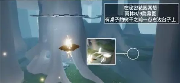 光遇5.24秘密花园冥想地点分享 首先玩家来到雨林,找到一个有个亭子的地方,非常好认。 然后需要玩家往右边走,可以看到一个洞,进入之后,需要玩家收集了雨林的八个先祖才可以解锁打开。 开启之后,会进入一个新场景,这个场景里面同样有个亭子,玩家直接飞到这个亭子里面。 然后往前面飞行,此时在如图所示的位置进行转弯,就可以看到这个冥想的位置了。