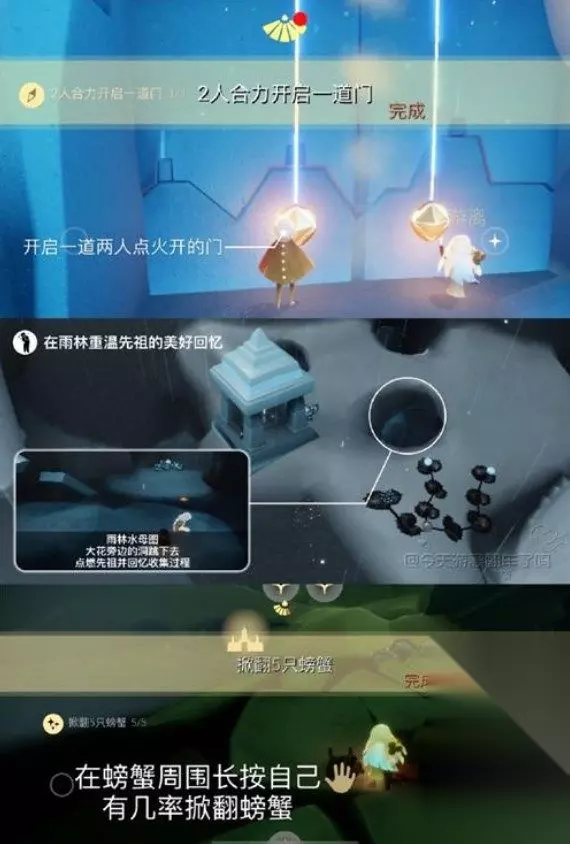 这个秘密花园冥想只要你知道了大体的方位,还是非常轻而易举就可以发现的。 5.24任务: 1.2人合力开门:和任意光崽合作开启任何一个两人门(推荐禁阁一层右侧二人门) 2.在雨林重温先祖回忆:哭泣动作先祖在雨林密林遗迹右侧的山洞里