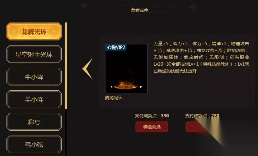 获取的成就点,可以在勇者宝库,根据心悦等级,兑换对应的心悦专属光环,称号和宠物,具体如下所示: 【1】龙腾光环,特邀兑换330点,心悦兑换280点;