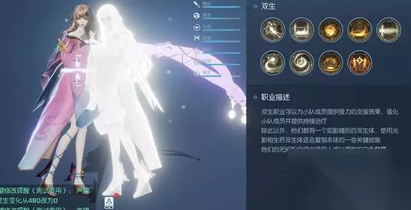 双生:法辅双生体。双生这个职业也是非常受大家喜欢,萌妹爱玩的也特别多。出场就特别霸气,一句话“我可不是一个人哦!”而且不仅可以给队友提供强大的后勤保障还可以奶血,控制敌军,给友军增益状态。PK时配合友军打出有效的控制,和持续增益的状态,谁不想得到双生的呵护。不止是这些,双生也是个法师,除了辅助以外,双生的法术技能爆发也是非常高,简直就是能奶能打,这个职业一定要注意走位,因为功能太强大,容易被针对哦。