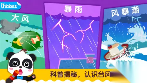 《宝宝天气认知》是一款很好的启蒙游戏,游戏还通过配音、音效和动画来增加趣味性。每当孩子完成一个任务,游戏中的角色会给予夸奖,增加孩子的成就感和参与感。音效和画面动画的变化,也能帮助孩子通过视觉和听觉感知不同天气的特征,比如在下雨时,孩子们能看到滴水的动画和听到雨滴的声音,进一步强化了他们的天气认知。 高速下载 普通下载 优先233乐园APP下载 4、《宝宝台风天气》