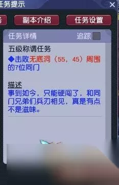 梦幻西游里面有很多的门派,今天给大家带来的是游戏里面的无底洞五级称谓流程,还有很多的小伙伴不清楚无底洞五级称谓怎么过,那么下面就是相关的攻略. 梦幻西游无底洞五级称谓流程 流程 1、与首席大弟子对话,点击“领取称谓” - “称谓任务”接取5级称谓任务;提示“领取称谓需要扣除100点门派贡献,并且任务失败也不退还”;