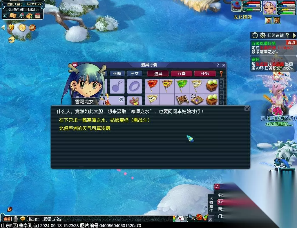 3、前往北俱芦洲(118,82)汲取寒潭之水;[战斗]