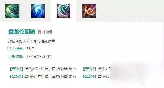 R盘龙轮回破:将正前方的敌人牵引到自己身旁造成伤害和破甲效果。固定CD、固定蓝耗的勾子类技能,伤害根据力量值高低进行计算。需要注意的是,和关平其他技能不同,这个技能是法术技能。