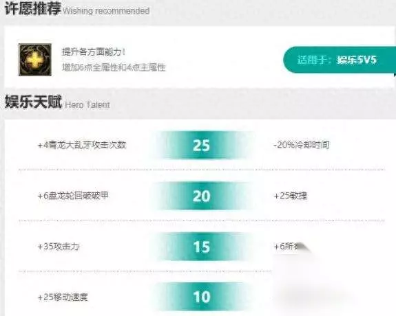 许愿天赋:属性是最好的选择,毕竟关平的伤害都是基于自身攻击、力量和敏捷属性的。所以,许愿天赋选择属性可以提高很多伤害。 技能加点:推荐主R副W,3级时先学1级E之后有大点大即可。虽然R技能是固定CD固定蓝耗,但技能等级高了之后伤害加成会大大提升不说,还能增强破甲效果增加后续W技能和普攻的伤害,所以主R副W算是非常不错的选择。之所以不推荐副E是因为这个技能伤害加成并没有想象中的高。 10级天赋:3点法力回复,因为关平前中期相对比较缺蓝所以法力回复非常重要。 15级天赋:个人更加推荐选择30点攻击力,用来增加普攻和W技能的伤害,不过15点敏捷也不算差,对普攻和W技能伤害加成有前者一半不说,还能增加E、F两个技能的伤害,所以这个看实际需求来选择更好。 20级天赋:6点盘龙轮回破破甲算得上是最好的选择,毕竟关平的大招虽然强大,但大多数时候都需要依靠R技能的勾和破甲效果来打出更多的伤害,且大后期之前需要利用大招打伤害的时候要少一些,所以增加6点R技能破甲无疑是个更好的选择。 25级天赋:根据实际情况来看,倘若自己伤害不足很难打死人的时候选择加3次F技能攻击次数是个不错的选择;反之在自己伤害足够,但是CD时间不够的时候,可以多多考虑20%减CD。 细节问题