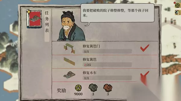 通关要点 繁荣度要跟上,可以用严大人带的娱乐建筑慢慢堆,这些还能回收,别自己建浪费饭和人。 被子在剧情任务里,按红框范围造就行。 火把也在剧情任务里,别搞错位置,装饰里的不是任务火把。 半山娘娘庙在山腰,位置不难找。 任务要建蟹塘,鱼塘不算,别犯低级错误。 篱笆门修复要提前建,竹子备足,按图索骥,一步步来。