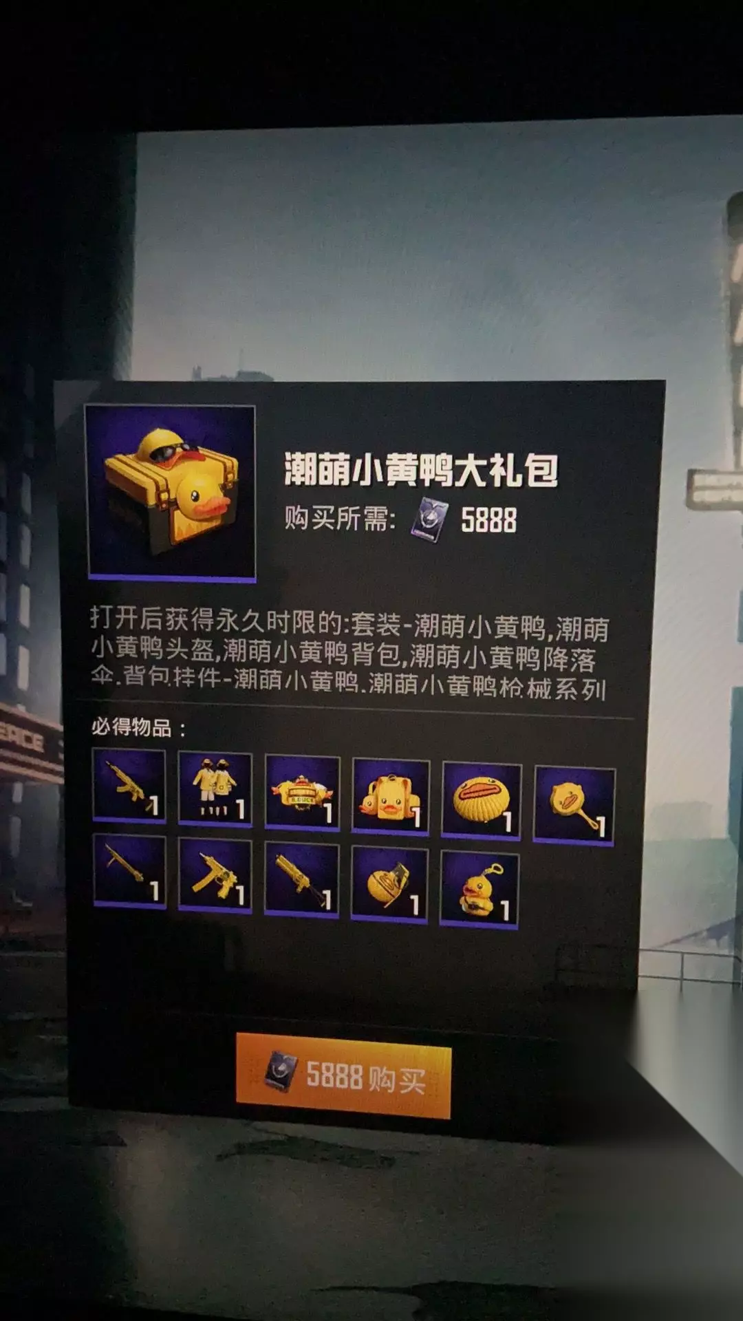 和平精英潮萌小黄鸭全套多少钱? 今天游戏中已经上线了潮萌小黄鸭套装了,因为这次的套装是直售的,玩家可以根据自己的需求来进行套装的购买。 玩家喜欢什么样子的皮肤就能购买什么样子的皮肤,每个皮肤的价格还是有点区别的,所以大家可以看着买。