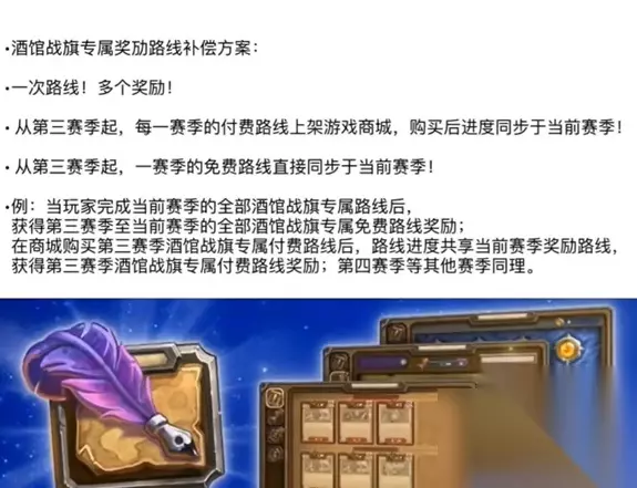 3、酒馆战旗专属奖励路线补偿方案: 一次路线!多个奖励! 从第三赛季起,每一赛季的付费路线上架游戏商城,购买后进度同步于当前赛季 从第三赛季起,一赛季的免费路线直接同步于当前赛季! 例:当玩家完成当前赛季的全部酒馆战旗专属路线后, 获得第三赛季至当前赛季的全部酒馆战旗专属免费路线奖励; 在商城购买第三赛季酒馆战旗专属付费路线后,路线进度共享当前赛季奖励路线 获得第三赛季酒馆战旗专属付费路线奖励;第四赛季等其他赛季同理。