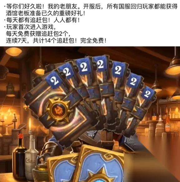 接下来小编就为大家带来炉石传说补偿领取方法。 想要领取炉石传说补偿卡包,大家只要耐心等待就好了。我怀疑我上的是假炉石传说 发放炉石传说补偿卡包的时候会在左下角出现提示:然后开心的开包吧。 炉石传说补偿规则 1、玩家首次进入游戏,每天免费获赠追赶包2个。 2、连续7天,共计14个追赶包!完全免费!