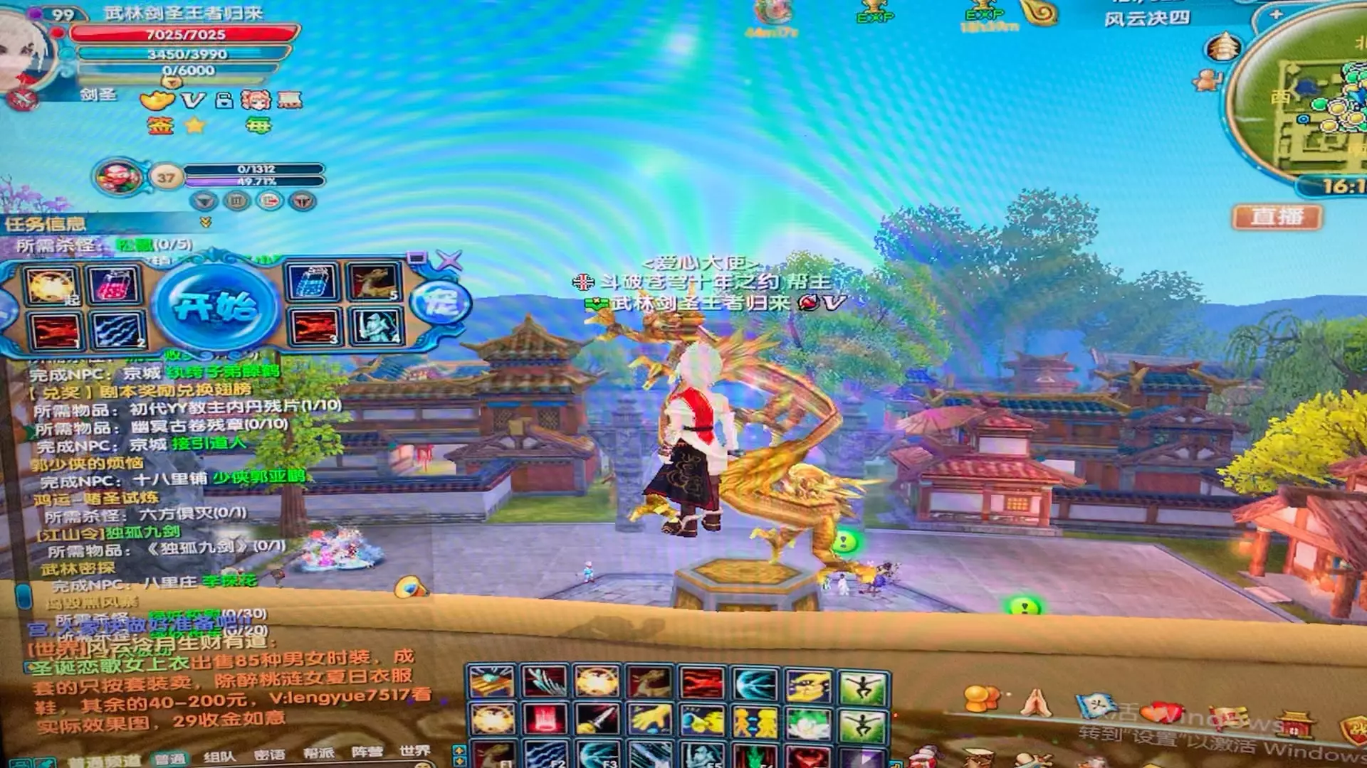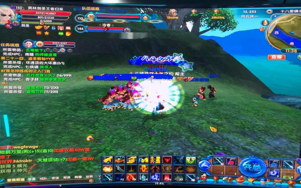 这是《武林外传》端游的游戏内容展示,玩家操控123级剑圣角色,在小跨服玩法里参与击杀BOSS黑龙王的战斗,还能看到任务信息与游戏地图等内容。
