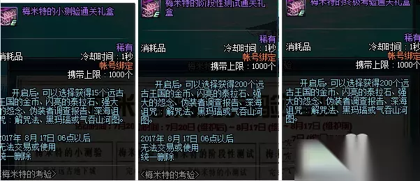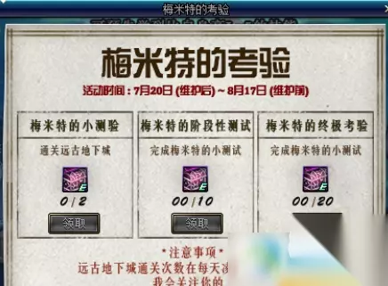 梅米特的考验活动时间为:7月20日到8月17日。玩家可以通关远古地下城完成第一个梅米特的小测验,活动小测验的通关礼盒。开启礼盒,可以获得15个远古王国的金币,闪亮的泰拉石,强大的怨念,伪装者调查报告,深海诅咒,解咒法,还有黑玛瑙火气吞上河图。 第二关是梅米特的阶段性测试,完成之后获得阶段性测试通关礼盒。开启之后可以选择获得200个远古王国的金币,闪亮的泰拉石,强大的怨念,伪装者调查报告,深海诅咒,解咒法还有黑玛瑙或者是气吞山河图。