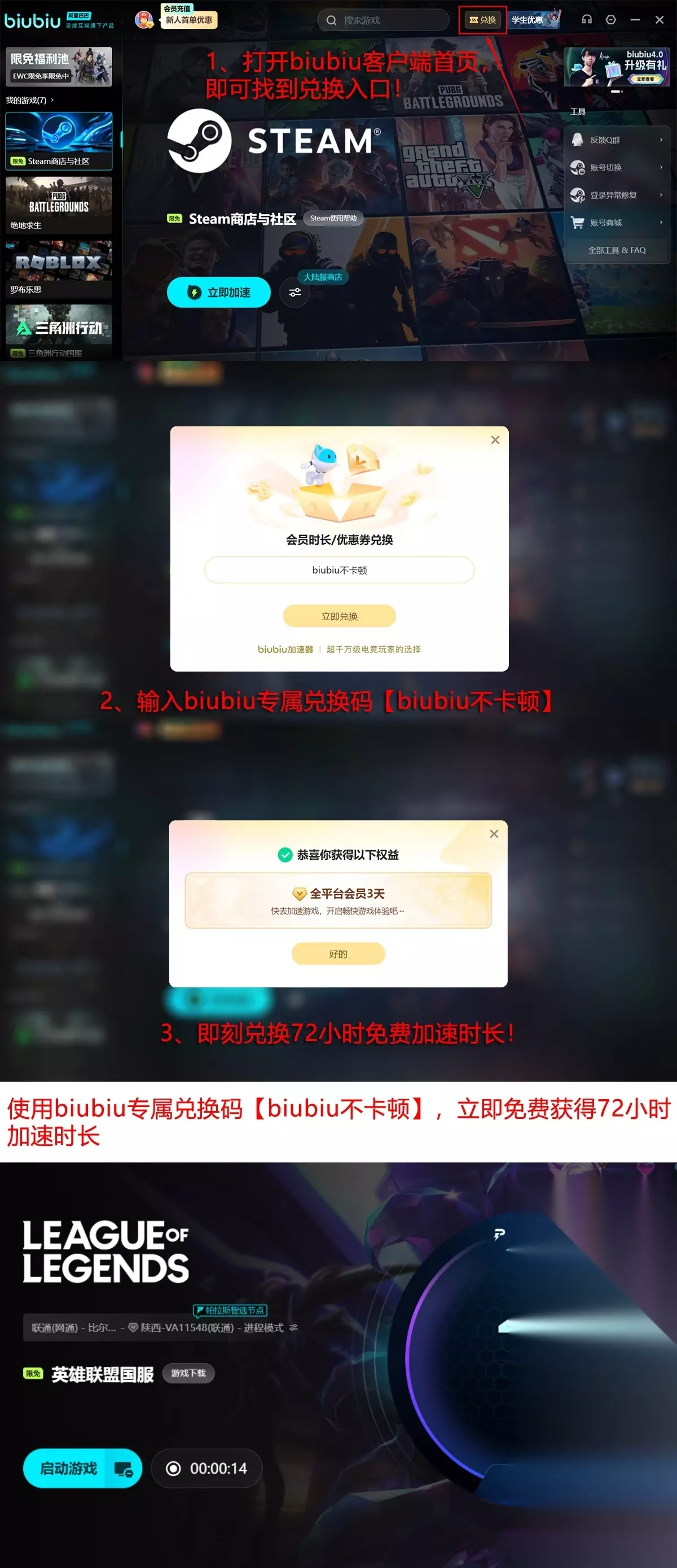 首次安装biubiu加速器的用户,注册即享1日免费加速权益。此外,所有用户输入专属兑换码【biubiu不卡顿】,均可额外领取3天全功能加速时长。新用户总计可获得4天无门槛试用机会。平台同步上线「新游速递」专区,实时同步《英雄联盟》版本更新公告、赛事日程及英雄平衡性调整详情。